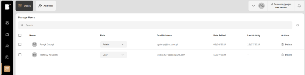 User management is accessible via the “Team” tab located on the left-hand side. Here, we can view and edit all added users along with their roles and relevant information.