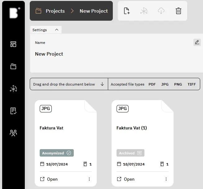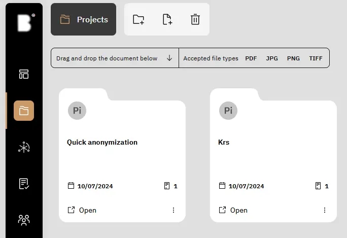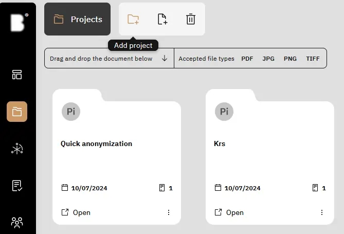 Before commencing document anonymization, it’s necessary to establish a project where documents can be securely submitted for processing. Access the ‘Projects’ tab by clicking the corresponding button located on the left-hand side.