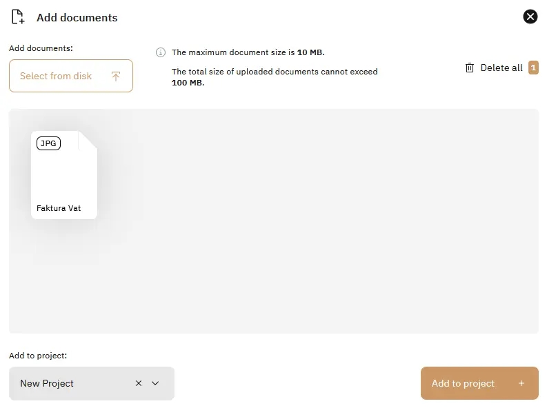 After clicking the “Select from disk” option, you can add files in the following formats: PNG, JPG, TIFF, PDF. The number of files able to be added depends on the limit stated above the file preview.