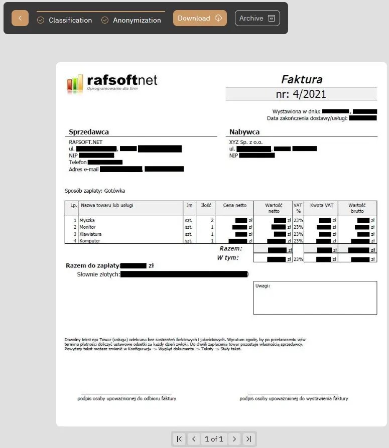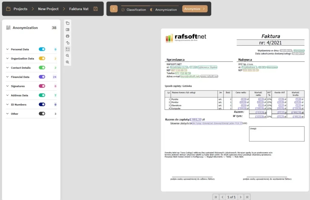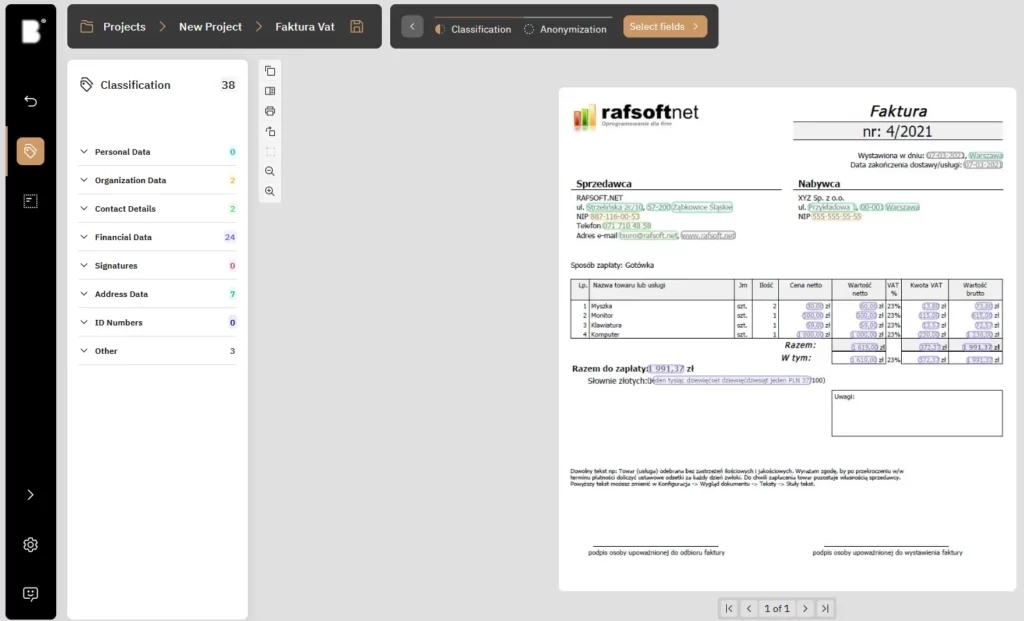Next, we have access to a variety of redaction schemes tailored to your specific requirements. These schemes are customizable to accommodate different document types. Furthermore, you can create your own anonymization fields, denoted by a square icon next to the rotation option. To finalize the anonymization process, simply click the ‘start anonymization’ button located above the document.